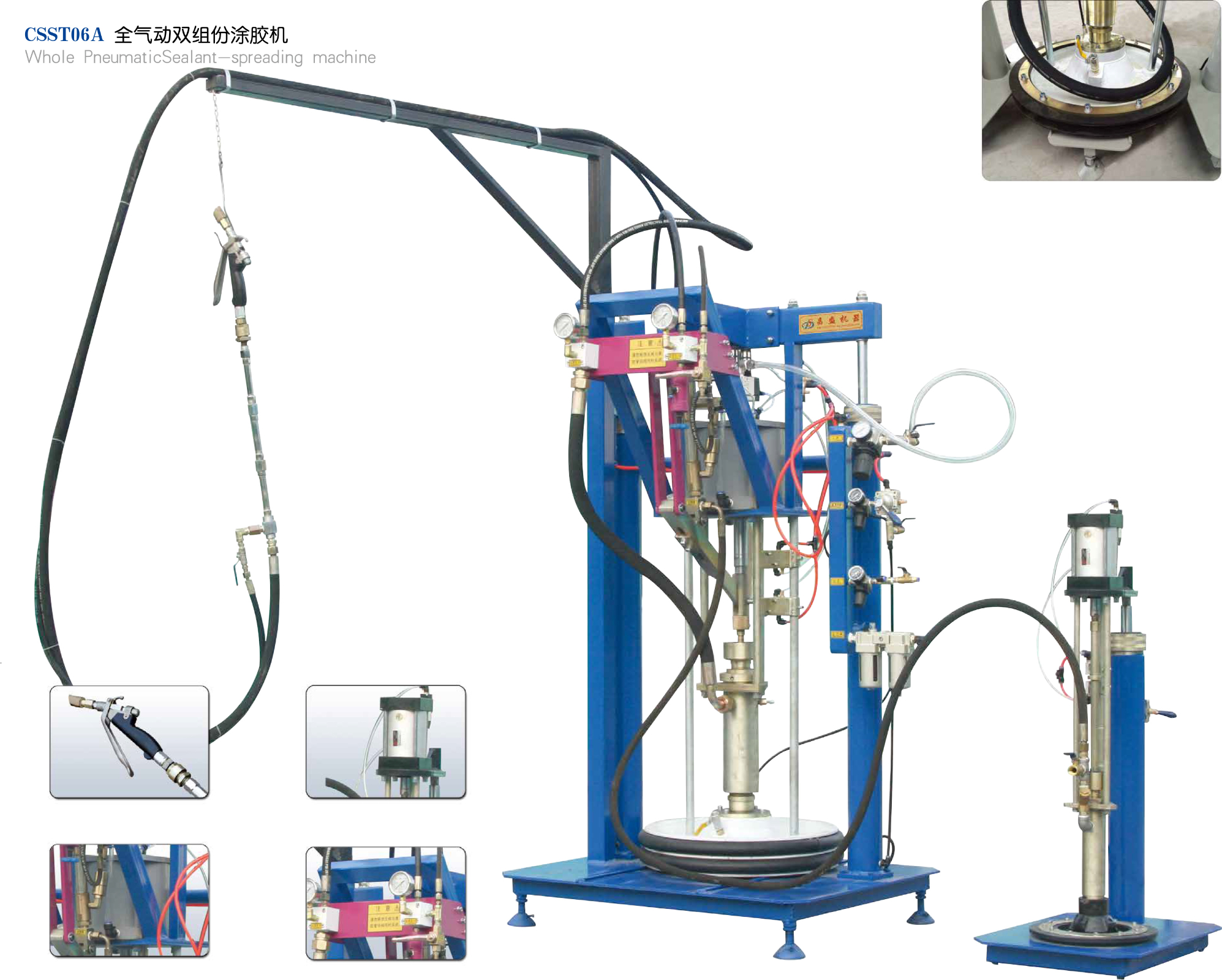 This machine is the production of hollow glass curtain wall , special glue equipment,realize the twosealing in A, B component mixed with glue once completed, particularly suited to the requirements ofproportioning precision demanding glue. Applicable to the doors and windows and curtain wall glass deepprocessing enterprises efficient, high quality, high rate of qualified pipelining production demand. Framewelding as a whole,increase Longmen frame,welding triangles to form the stable structure ,overcome thecantilever beam when shaking; B pump adopts double column, pressure plate double sealing, completelysolve the black component glue oxidized easily leak problem; optimum pipeline design, solves the productsof the same kind of slow flow problem .